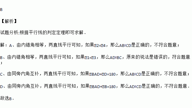 A. 如果∠2=∠4,那么AB∥CD B. 如果∠1=∠3,那么AB∥CD
