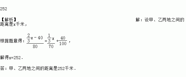 252 【解析】【解析】 设甲、乙两地之间的距离是x千米, 根据题意得:=+, 解得x=252. 答:甲、乙两地之间的距离是252千米.