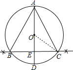 (2)连结CO,BC交AD于D,如图,由于BC垂直平分OD,易得OE=$\frac{1}{2}$OC,在Rt△OEC中,利用三角函数定义可求出∠OCE=30°,则∠COE=60°,再根据垂径定理得到$\widehat{AB}$=$\widehat{AC}$,$\widehat{BD}$=$\widehat{CD}$,则AB=AC,根据圆周角定理得到∠BAD=∠CAD=$\frac{1}{2}$∠COE=30°,即∠BAC=60°,于是可判断△ABC为等边三角形.