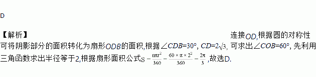 如图,AB是⊙O的直径,弦CD⊥AB,∠CDB=30°,CD=2,则阴影部分图形的面积为( )