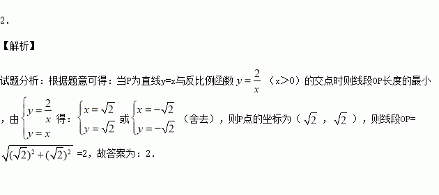 在平面直角坐标系xOy中,P为反比例函数(x>0)的图象上的动点,则线段OP长度的最小值是 .