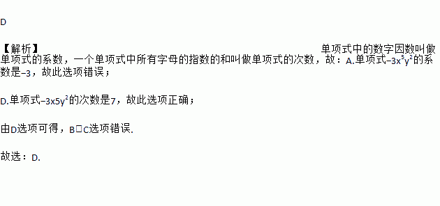 D 【解析】单项式中的数字因数叫做单项式的系数,一个单项式中所有字母的指数的和叫做单项式的次数,故:A.单项式?3x5y2的系数是?3,故此选项错误; D.单项式?3x5y2的次数是7,故此选项正确; 由D选项可得,B,C选项错误. 故选:D.