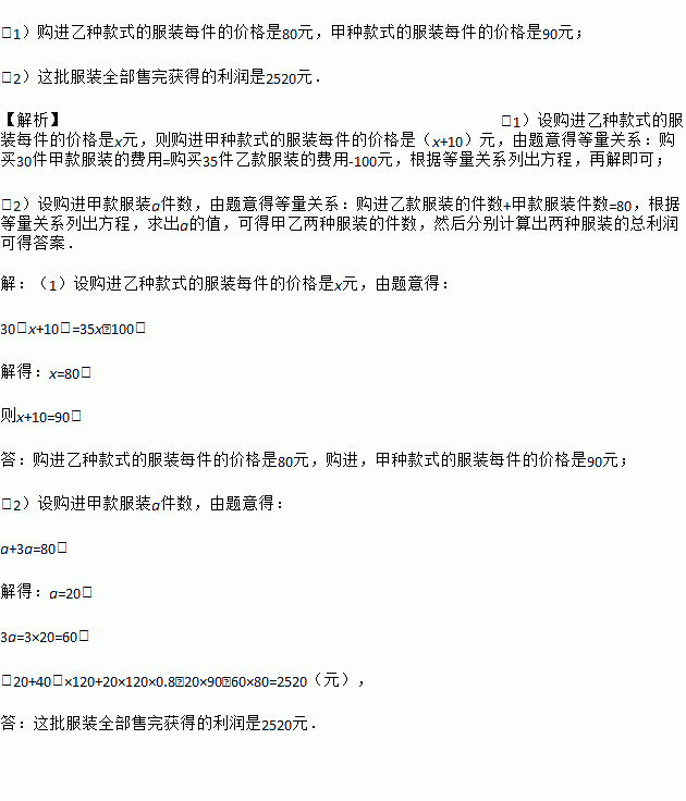 (1)购进乙种款式的服装每件的价格是80元,甲种款式的服装每件的价格是90元; (2)这批服装全部售完获得的利润是2520元. 【解析】(1)设购进乙种款式的服装每件的价格是x元,则购进甲种款式的服装每件的价格是(x+10)元,由题意得等量关系:购买30件甲款服装的费用=购买35件乙款服装的费用-100元,根据等量关系列出方程,再解即可; (2)设购进甲款服装a件数,由题意得等量...