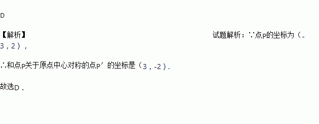 在直角坐标系中,点P的坐标为(-3,2),则和点P关于原点中心对称的点P′的坐标是 ( )