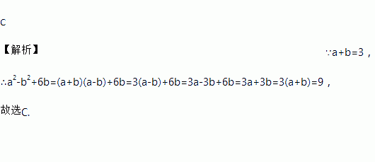 C 【解析】∵a+b=3, ∴a2-b2+6b=(a+b)(a-b)+6b=3(a-b)+6b=3a-3b+6b=3a+3b=3(a+b)=9, 故选C.