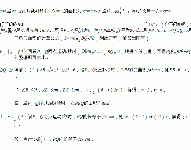 (1)若△PBQ的面积等于8cm2,求t的值;