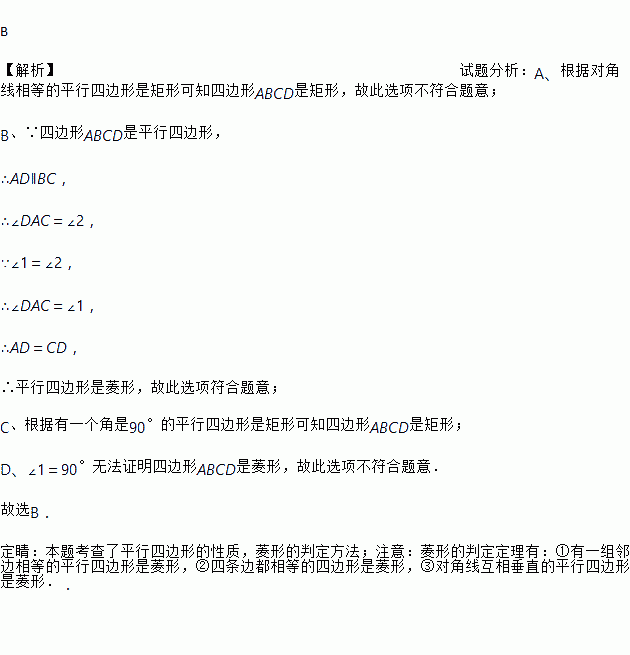 B 【解析】试题分析:A、根据对角线相等的平行四边形是矩形可知四边形ABCD是矩形,故此选项不符合题意; B、∵四边形ABCD是平行四边形, ∴AD∥BC, ∴∠DAC=∠2, ∵∠1=∠2, ∴∠DAC=∠1, ∴AD=CD, ∴平行四边形是菱形,故此选项符合题意; C、根据有一个角是90°的平行四边形是矩形可知四边形ABCD是矩形; ...