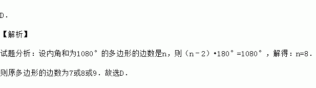 D. 【解析】 试题分析:设内角和为1080°的多边形的边数是n,则(n﹣2)•180°=1080°,解得:n=8. 则原多边形的边数为7或8或9.故选D.