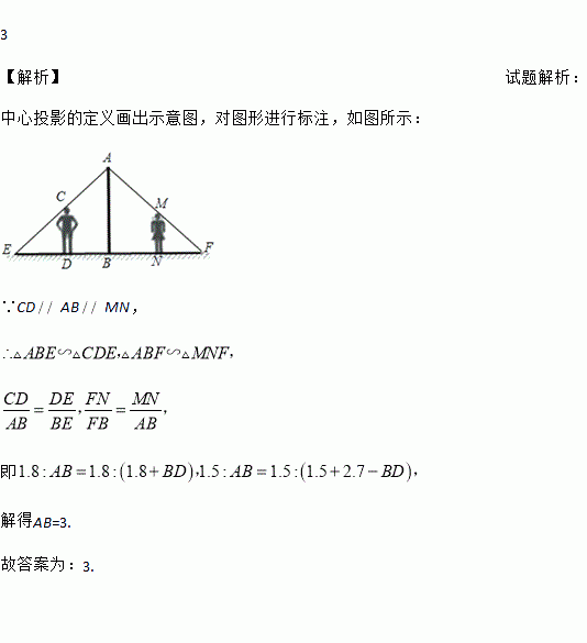 如图,小明、小丽之间的距离为2.7m,他们在同一盏路灯下的影长分别为1.8m、1.5m,已知小明、小丽的身高分别为1.8m、1.5m,则路灯的高为 m.