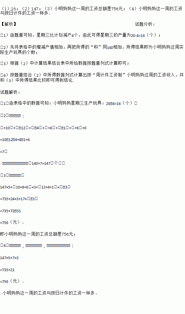 (1)根据记录的数据可知小明妈妈星期三生产玩具 个;