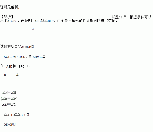 如图,点A、C、D、B四点共线,且AC=BD,∠A=∠B,∠ADE=∠BCF,求证:DE=CF.