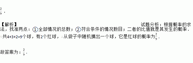 不透明袋子中装有9个球,其中有2个红球、3个绿球和4个蓝球,这些球除颜色外无其他差别.从袋子中随机取出1个球,则它是红球的概率是 .