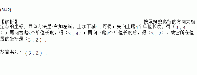 一只蚂蚁由(0,0)先向上爬4个单位长度,再向右爬3个单位长度,再向下爬2个单位长度后,它所在位置的坐标是____.