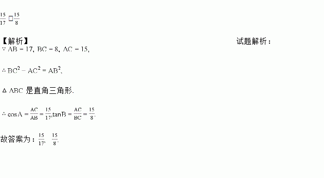 △ABC中,AB=17,BC=8,AC=15,则cosA、tanB的值分别为__________.