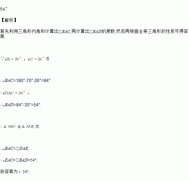 如图,中,,,≌,若恰好经过点B,交AB于D,则的度数为______