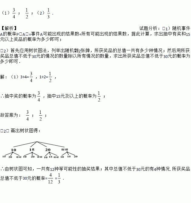 ⑴如果随机翻1张牌,那么抽中有奖的概率为 ,抽中15元及以上奖品的概率为 .