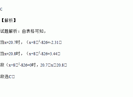 分析表格中的数据,估计方程(x+8)2-826=0的一个正数解x的大致范围为( )