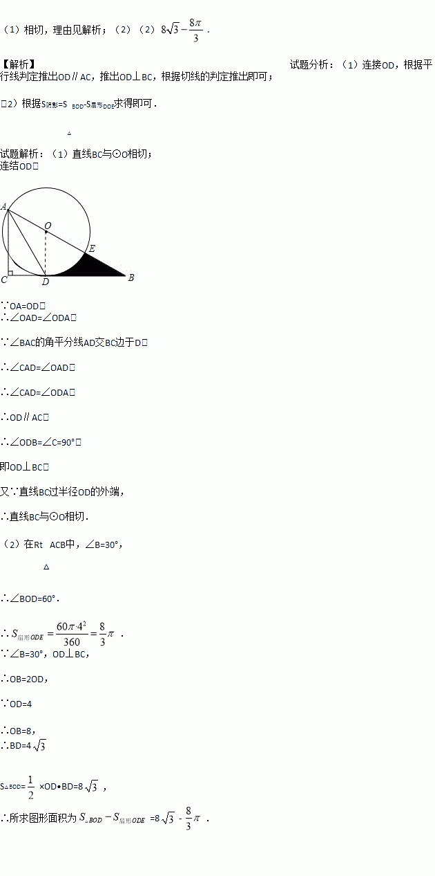 (2)若⊙O的半径为4,∠B=30°.求线段BD、BE与劣弧DE所围成的阴影部分的图形面积.