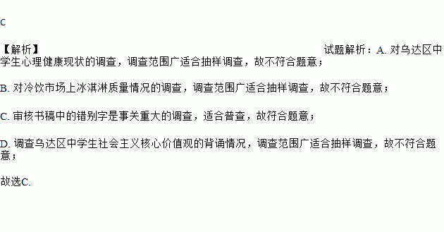 C 【解析】试题解析:A. 对乌达区中学生心理健康现状的调查,调查范围广适合抽样调查,故不符合题意; B. 对冷饮市场上冰淇淋质量情况的调查,调查范围广适合抽样调查,故不符合题意; C. 审核书稿中的错别字是事关重大的调查,适合普查,故符合题意; D. 调查乌达区中学生社会主义核心价值观的背诵情况,调查范围广适合抽样调查,故不符合题意; 故选C.