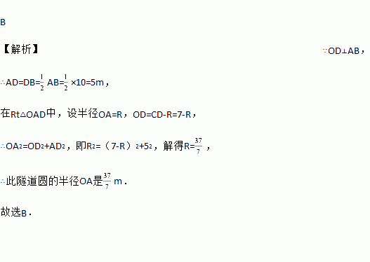 如图所示是一个单心圆曲隧道的截面,若路面AB宽为10 m,净高CD为7 m,则此隧道单心圆的半径OA的长是( )
