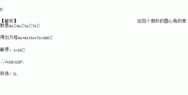 D 【解析】设四个扇形的圆心角的度数是4x,4x,5x,7x, 得出方程4x+4x+5x+7x=360, 解得:x=18, ∴7×18=126°. 故选:D.