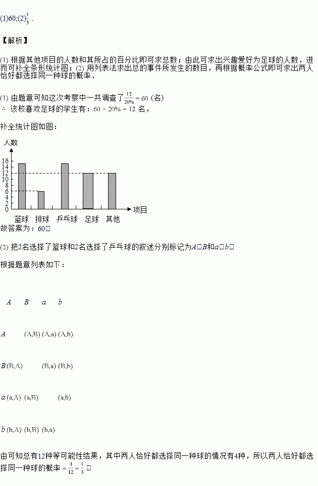 被调查同学中恰好有4名学来自初一2班,其中有2名同学选择了篮球,有2名同学选择了乒乓球,曹老师打算从这4名同学中选择两同学了解他们对体育社团的看法,请用列表法或画树状图法,求选出的两人恰好都选择同一种球的概率.![]()