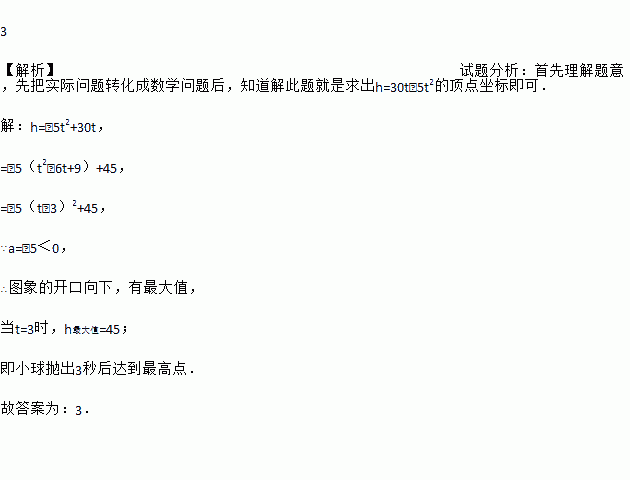 从地面竖直向上抛出一个小球,小球的高度h(米)与运动时间t(秒)之间的关系式为h=30t﹣5t2,那么小球抛出 秒后达到最高点.