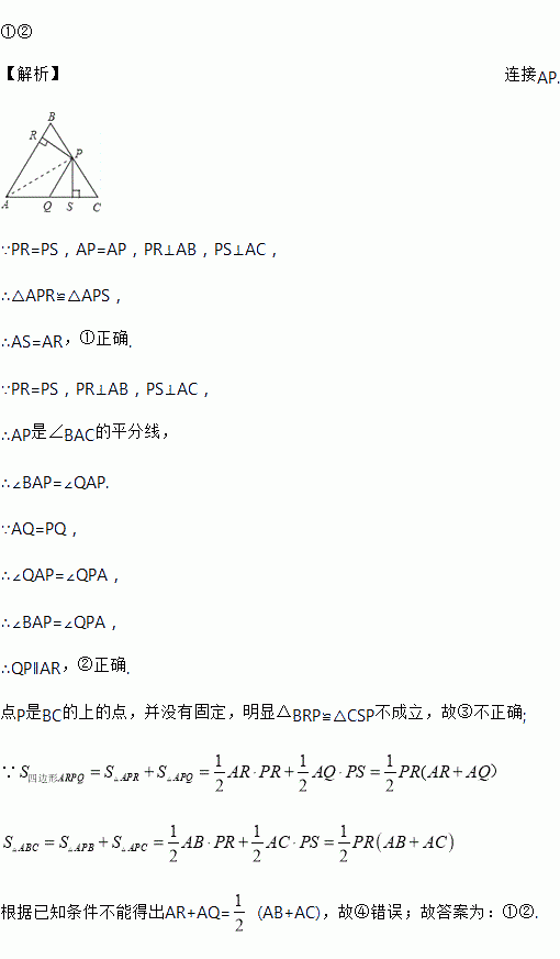 AR;②QP∥AR;③△BRP ≌△CPS;④S四边形ARPQ=
