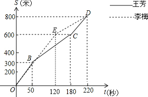 ÔÚ2012ÄêÈÕÊгõÖÐѧҵˮƽ¿¼ÊÔÌåÓýѧ¿ÆµÄÅ®×Ó800Ã×ÄÍÁ¦²âÊÔÖУ¬Ä³¿¼µãµÄÍõ·¼Í¬Ñ§ËùÅܵÄ·³Ì s£¨Ã×£©ÓëËùÓÃʱ¼ä t £¨Ã룩֮¼äµÄº¯ÊýͼÏóΪÕÛÏßOBCD£®ºÍËýͬʱÆðÅܵÄÀî÷ͬѧǰ600Ã×µÄËٶȱ£³ÖÔÚ5Ã×/Ã룬ºóÀ´ÒòΪÌåÁ¦Ï½µ£¬ËٶȱäÂý£¬µ«»¹±£³ÖÔÈËÙ±¼ÅÜ£¬½á¹ûºÍÍõ·¼Í¬Ñ§Í¬Ê±µ½´ïÖյ㣮