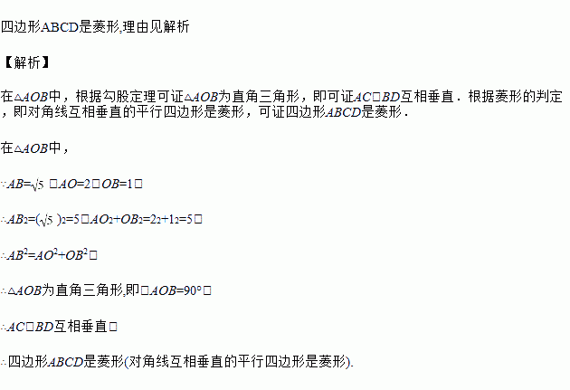平行四边形ABCD的两条对角线AC、BD相交于点O, AB=, AO=2, OB=1. 四边形ABCD 是菱形吗?为什么?