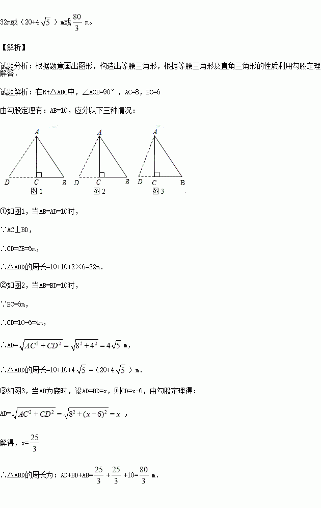 某园艺公司对一块直角三角形的花圃进行改造.测得两直角边长为6m、8m.现要将其扩建成等腰三角形,且扩充部分是以8m为直角边的直角三角形.求扩建后的等腰三角形花圃的周长