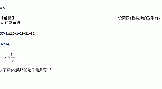 2001年某省体育事业成绩显著,据统计,在有关大赛中获是奖牌数如下表所示(单位:枚),如果只获得1枚奖牌的选手有57人,那么荣获3枚奖牌的选手最多有______人.