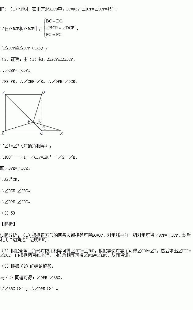 (3)把正方形ABCD改为菱形,其它条件不变(如图②),若∠ABC=58°,则∠DPE= 度.