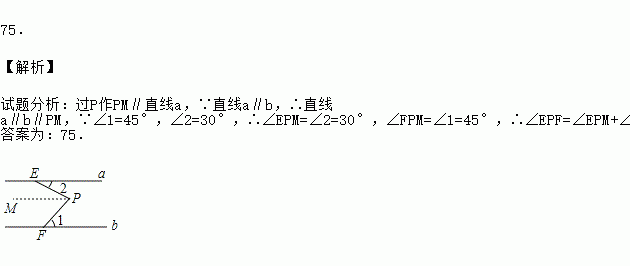 如图,直线a∥b,∠1=45°,∠2=30°,则∠P= °.