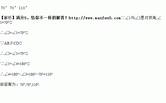 如图,已知AB∥CD,∠1=70°,则∠2=__,∠3=__,∠4=___.