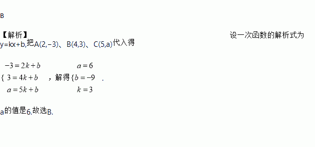 B 【解析】设一次函数的解析式为y=kx+b,把A(2,?3)、B(4,3)、C(5,a)代入得 ,解得. a的值是6.故选B.