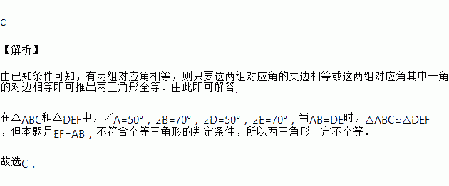 在△ABC和△DEF中,∠A=50°,∠B=70°,AB=3cm,∠D=50°,∠E=70°,EF=3cm.则△ABC与△DEF( )