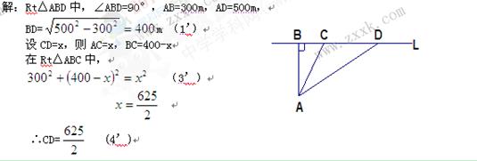 22、如图,某学校(A点)与公路(直线L)的距离为300米,又与公路车站(D点)的距离为500米,现要在公路上建一个小商店(C点),使之与该校A及车站D的距离相等,求商店与车站之间的距离.