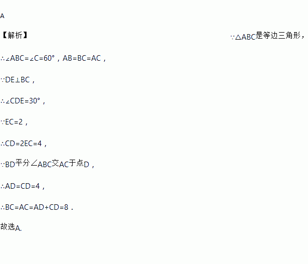 A 【解析】∵△ABC是等边三角形, ∴∠ABC=∠C=60°,AB=BC=AC, ∵DE⊥BC, ∴∠CDE=30°, ∵EC=2, ∴CD=2EC=4, ∵BD平分∠ABC交AC于点D, ∴AD=CD=4, ∴BC=AC=AD+CD=8. 故选A.