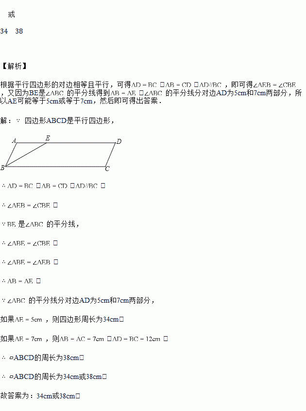 已知?ABCD中,平分线交边AD于点E,并把边AD为5cm和7cm两部分,则?ABCD的周长为______cm.