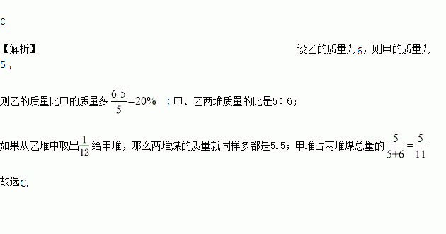 ①乙堆的质量比甲堆多20% ②甲、乙两堆质量的比是6∶7