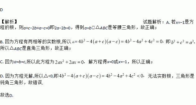 已知关于x的一元二次方程(a+c)x2+2bx+a﹣c=0,其中a、b、c分别为△ABC三边的长.下列关于这个方程的解和△ABC形状判断的结论错误的是( )