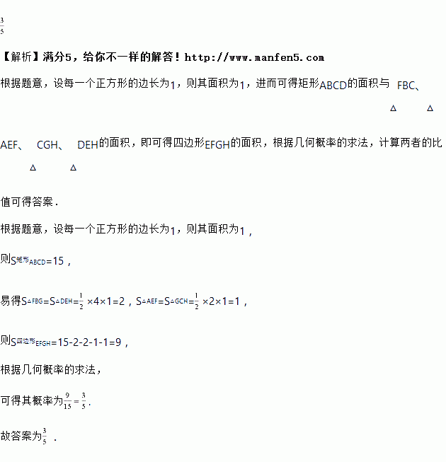如图,将矩形分成个大小相等的正方形,、、、分别在、、、边上,且是某个小正方形的顶点.若一只小猫在这个图形上玩耍,则落在四边形内的概率是________.