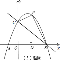 (3)根据平行于BC的直线与抛物线只有一个交点时△BCP面积最大,先求出直线BC的解析式为y=-x+3,再设出平行于直线BC的直线的解析式y=-x+b,然后与抛物线联立,消掉未知数y,得到关于x的一元二次方程,利用根的判别式△=0列式求出b值,再求出点P的坐标,过点P作PD⊥x轴于D,根据S△BCP=S梯形ODPC+S△PBD-S△OBC列式计算即可得解.