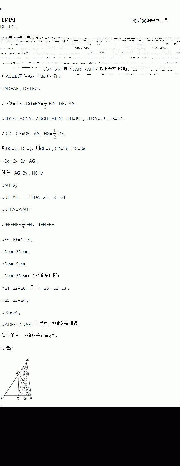 如图,在△ABC中,D是BC的中点,DE⊥BC交AC于点E,已知AD=AB,连接BE交AD于点F,下列结论:①BE=CE;②∠CAD=∠ABE;③S△ABF=3S△DEF;④△DEF∽△DAE,其中正确的有( )