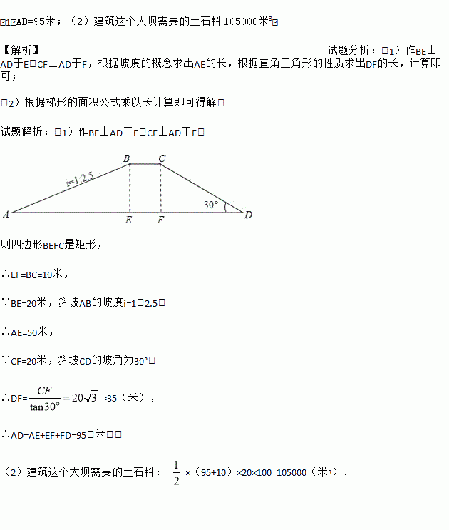 如图,水库大坝的横断面为四边形ABCD,其中AD∥BC,坝顶BC=10米,坝高20米,斜坡AB的坡度i=1:2.5,斜坡CD的坡角为30°.