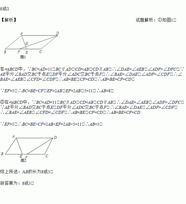 在?ABCD中,AE平分∠BAD交边BC于E,DF平分∠ADC交边BC于F,若AD=11,EF=5,则AB=_____.