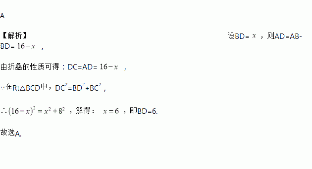 A 【解析】设BD= ,则AD=AB-BD= , 由折叠的性质可得:DC=AD= , ∵在Rt△BCD中,DC2=BD2+BC2, ∴,解得: ,即BD=6. 故选A.