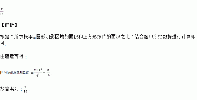 在一张边长为4cm的正方形纸上做扎针随机试验,纸上有一个半径为1cm的圆形阴影区域,则针头扎在阴影区域内的概率为__________;