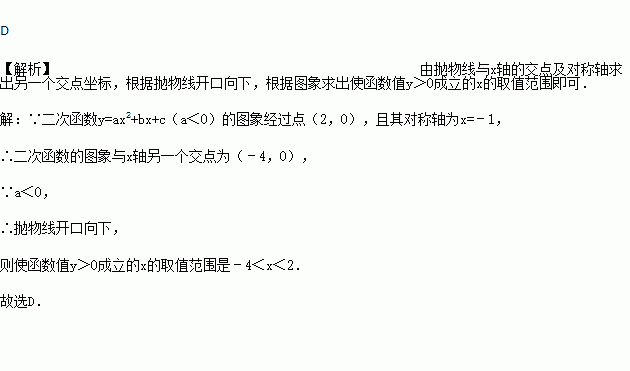 若二次函数y=ax2+bx+c(a<0)的图象经过点(2,0),且其对称轴为x=﹣1,则使函数值y>0成立的x的取值范围是( ).